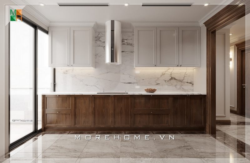 Thiết kế một không gian phòng khách liền bếp ăn theo phong cách tân cổ điển đẹp và sang trọng cho các biệt thự, nhà phố.