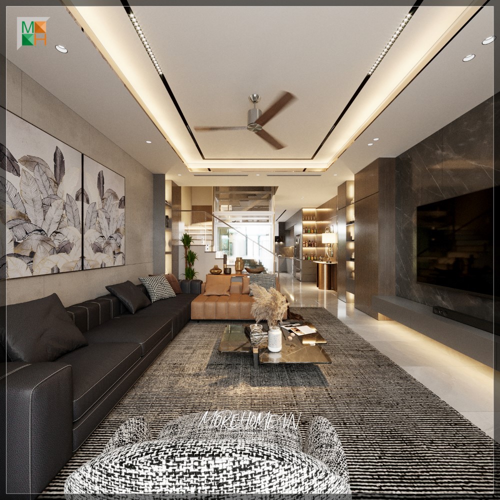 Thiết kế phòng khách hiện đại với sự pha trộn sofa 2 bộ màu tạo nên không gian đỡ nhàm chán cho phòng khách kết hợp cùng bàn trà mặt đá hình dáng độc đáo và vách tivi đá màu trầm khiến cho không gian phòng khách thêm tinh tế sang trọng.